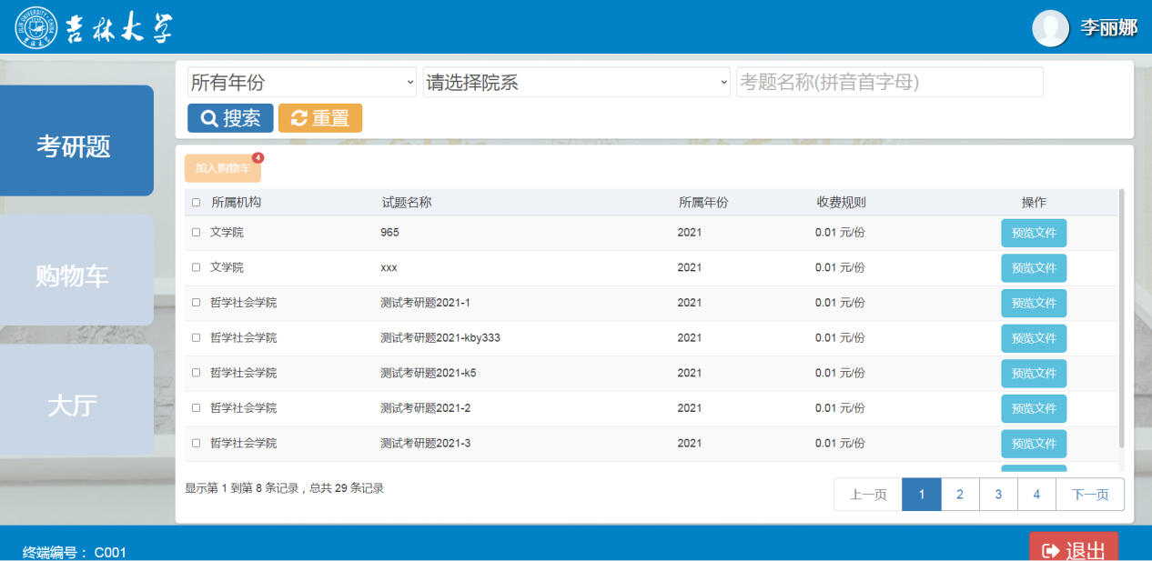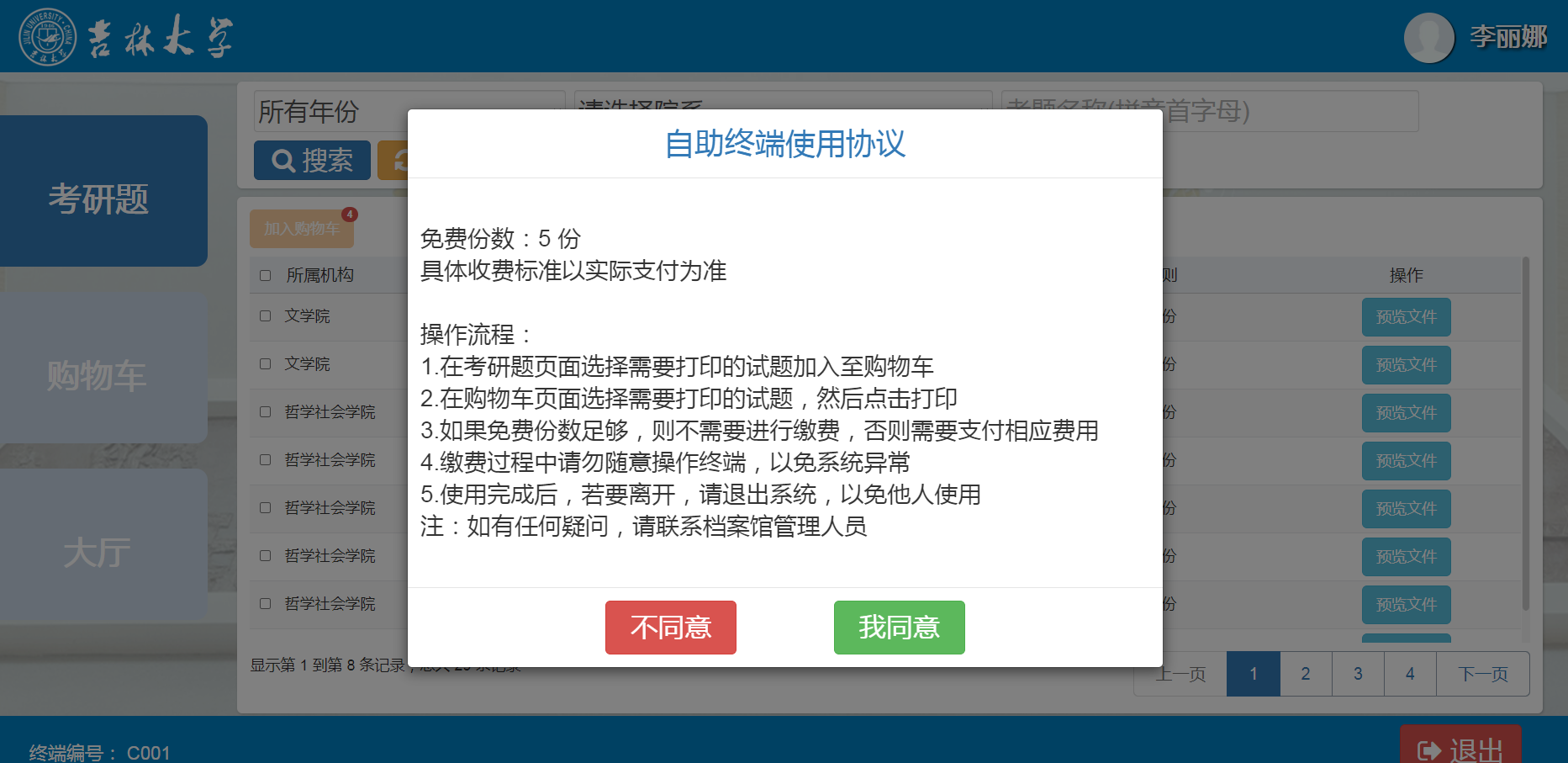 (3)考研题模块:学生可以在自助终端机上自助查询并打印自己所需的考研题。学生可以通过年份,院系等检索,来查询找到自己所需的考研题。