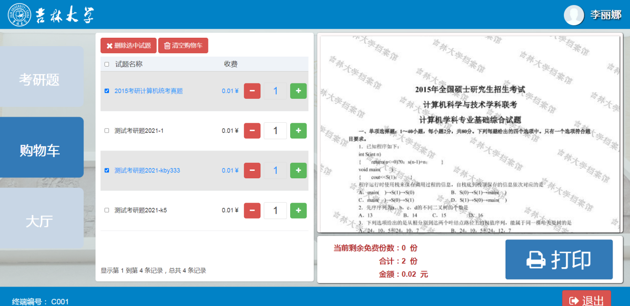 (4)购物车模块:学生选择好考研题后,在购物车内进行结算打印