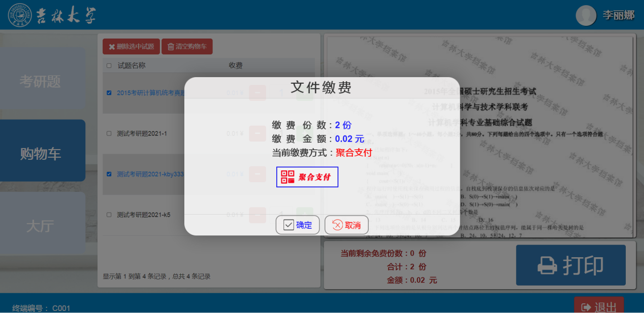 选择好考研题后点击打印,进行缴费打印,选择缴费方式,缴费完成后自动打印出考研题。